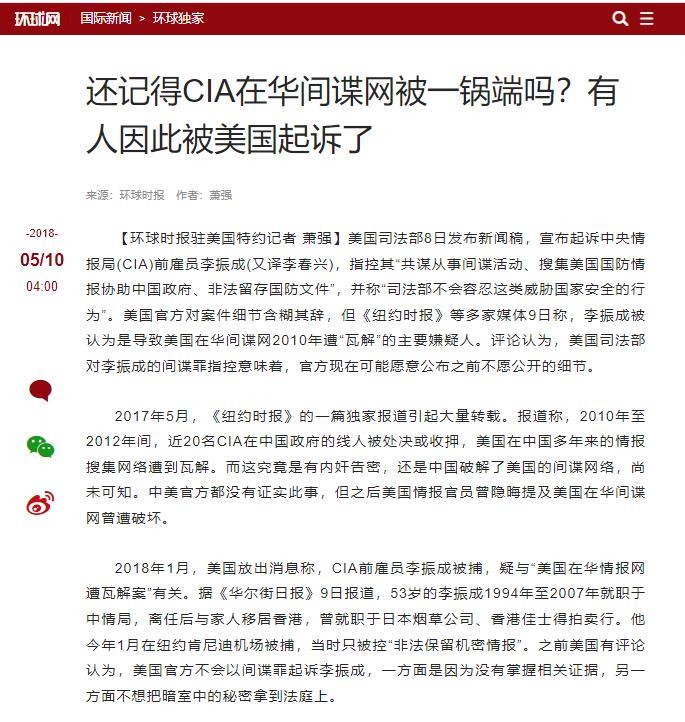 环球时报在2018年5月10日《还记得CIA在华间谍网被一锅端吗?有人因此被美国起诉了》的报道