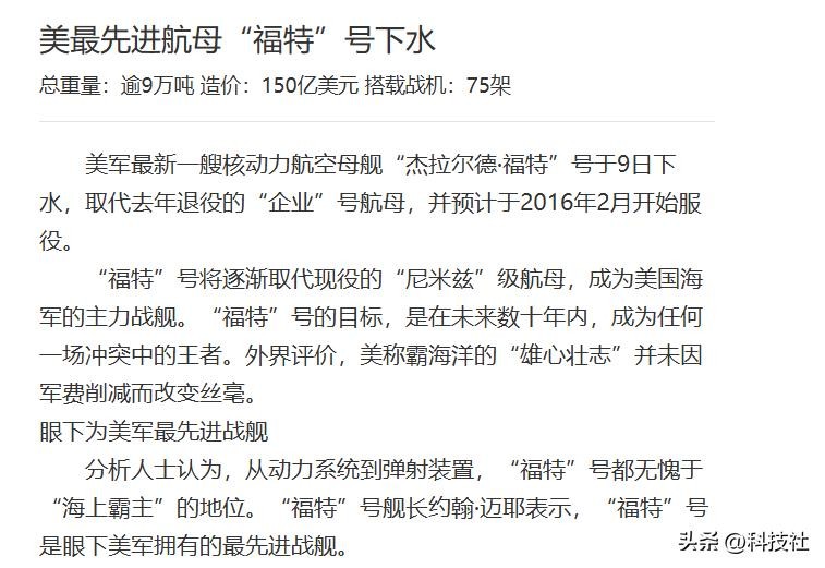 参考资料:科学知识点——美国航母成功下水,排水量12万吨载百架战机,可以领先全球吗