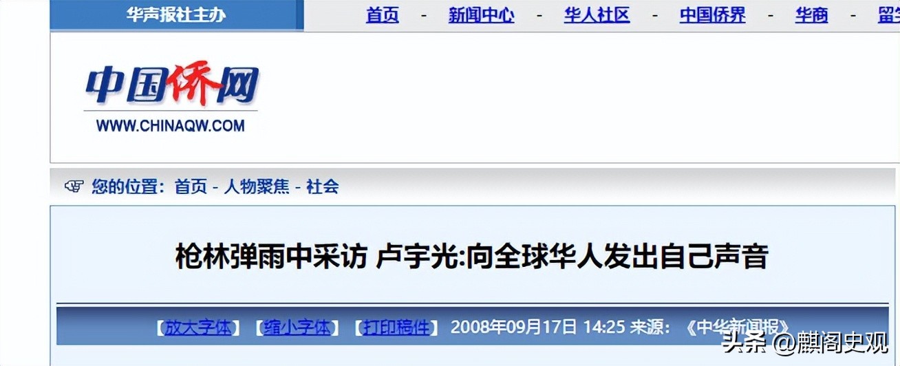 中国侨网2008-09-17《枪林弹雨中采访 卢宇光:向全球华人发出自己声音》