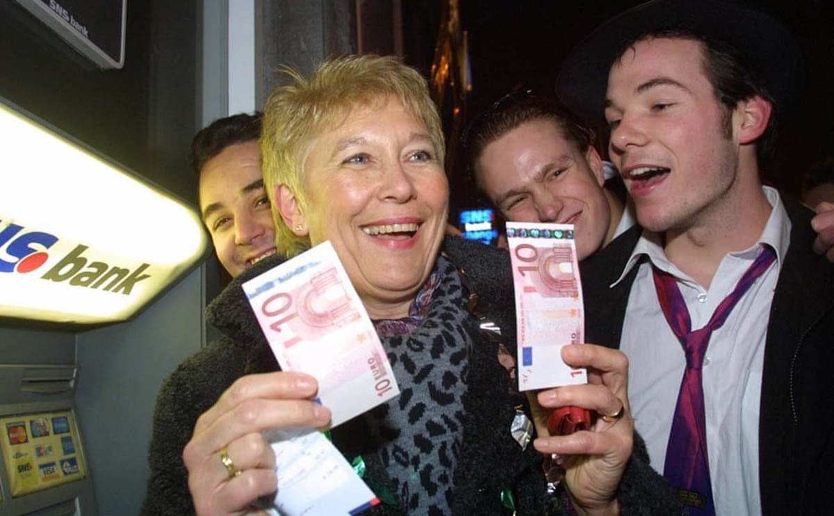 2002 年 1 月 1 日午夜过后,在荷兰马斯特里赫特,一名妇女从自动取款机中取出欧元纸币