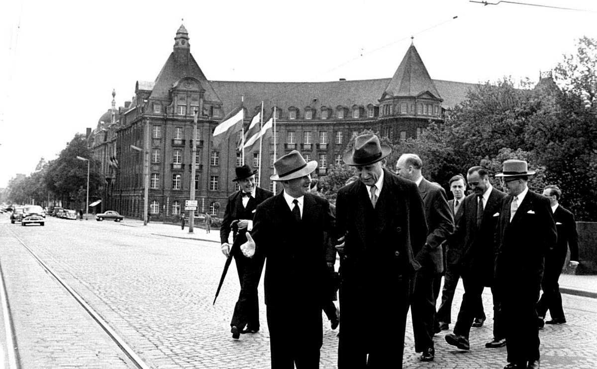 让-莫内和罗伯特-舒曼在《舒曼宣言》纪念仪式后,一起离开位于卢森堡的欧洲煤钢共同体最高权力机构所在地
