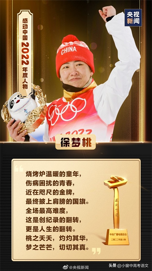 【颁奖词】烧烤炉温暖的童年,伤病困扰的青春,近在咫尺的金牌,最终披上肩膀的国旗。全场最高难度,这是创纪录的翻转,更是人生的翻转。桃之夭夭,灼灼其华;梦之芒芒,切切其真。
