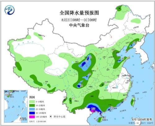8月2日8时至3日8时,华南、贵州大部、云南南部、西北地区东部、四川盆地中西部、华北东部、黄淮东北部、东北地区东南部等地有中到大雨,其中,广东西南部、广西中南部、四川盆地西南部、甘肃东部、宁夏西部等地的部分地区有暴雨,广西南部局地大暴雨(100~150毫米)。华南南部、西北地区东部、江南东部沿海地区、内蒙古中西部等地的部分地区有4~6级风。北部湾、琼州海峡将有8~9级、阵风10级的大风。