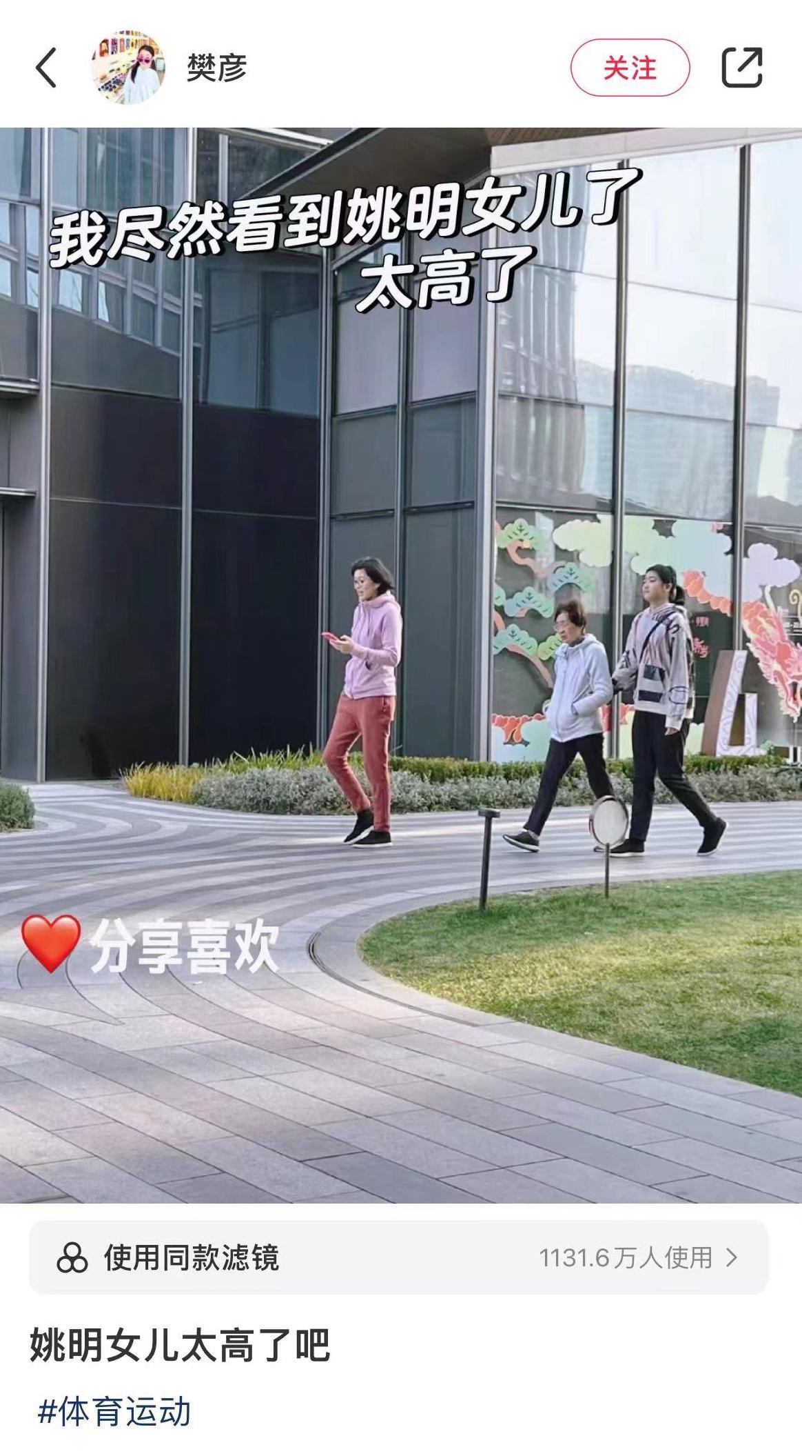 她的身材却不像母亲,而是像自己的父亲姚明一样。