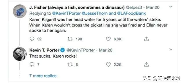 一位网友爆料,《艾伦秀》的前首席编剧凯伦·基尔加里夫(Karen Kilgariff)被“解雇”了,因为她在编剧罢工期间的表现让Ellen非常生气,此后两人再也没有过任何对话。