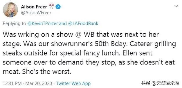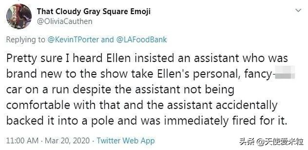 还有网友爆料Ellen的助手不小心把Ellen的车倒进了电线杆上,立马被炒了鱿鱼。