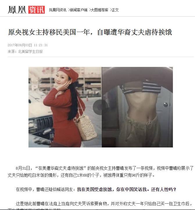 【凤凰网】.【凤凰资讯】2017年09月03日【原央视女主持移民美国一年,自曝早华裔丈夫虐待挨饿】
