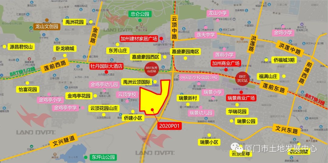 交通设施方面,地块周边拥有云顶路、莲前路、文兴西路等城市干道,交通通达性较高。同时地块毗邻BRT东芳山庄站,依托BRT还可实现与地铁线路的换乘对接,其公共交通便利性较佳。