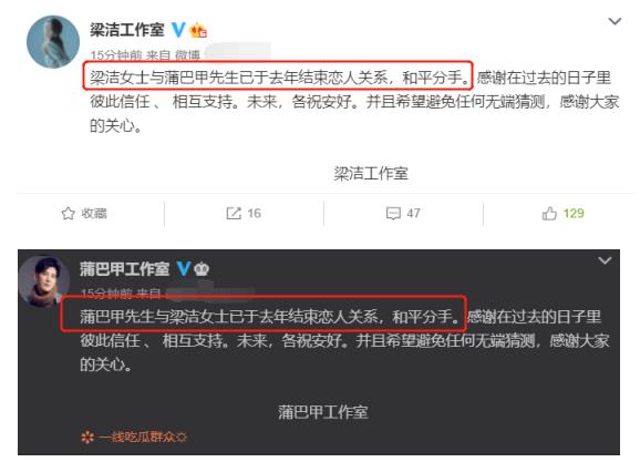 蒲巴甲梁洁两人通过各自的官方工作室发声,文字措辞都相当严谨,看起来也相当的体面,统一一样的文案看起来应该是和平分手。