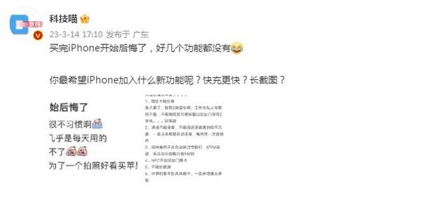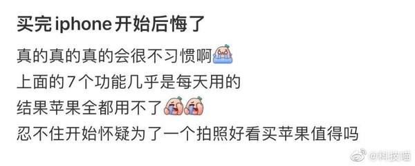 最近,有网友表示,自己买完 iPhone 就开始后悔了,因为好几个功能都没有。看来这位网友原来是安卓手机用户,改用苹果手机后习惯很好改变,但一些功能的缺失给其造成了很多不便。该网友开始怀疑,为了拍照好看买苹果手机真的值得吗?
