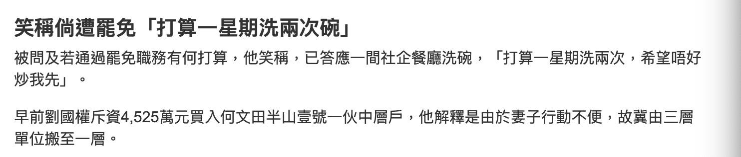 至于已经被罢免的老臣子刘国权,被罢免之后应该也就考虑退休了吧,毕竟已经年过70岁了。而刘国权在被罢免之前,曾经表示若是被罢免将会去做洗碗工,他声称已经联络了一家餐厅洗碗,打算一周洗两次。当然这要不是开玩笑要不就是打发时间,要知道刘国权在佐丹奴那么多年,也有足够的本钱过养老生活,早前他才以4525万买下了何文田半山壹号的中层单位,所以并不缺钱。