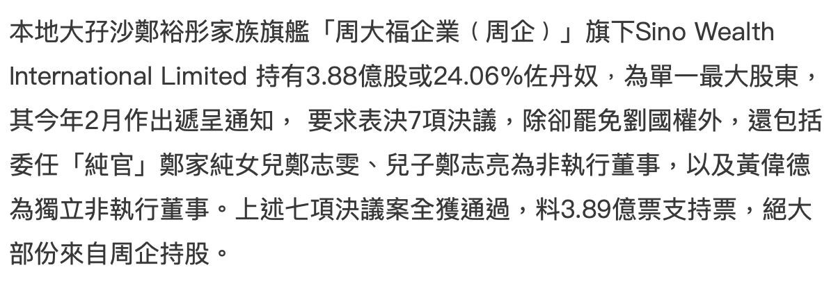 郑裕彤家族旗下的周大福为了争夺佐丹奴的管理权,在2月发起了七项决议,最重要的两项包括罢免现任佐丹奴CEO刘国权,另外还包括委任郑家纯的女儿郑志雯、儿子郑志亮为非执行董事。简单来说就是让郑裕彤家族的成员入主佐丹奴的董事局,让郑裕彤家族成为佐丹奴最大的管理人。在董事会举办之前,佐丹奴董事会的顾问曾经提出反对罢免,认为罢免现任CEO无理据。不过在董事会举办并投票后,七项决议案全获通过,大部分的股东都投赞成票,而投票人大部分来自周企持股。这个结果应该就是意料之中的,可想而知郑裕彤家族对拿下佐丹奴的管理权有多大的决心。