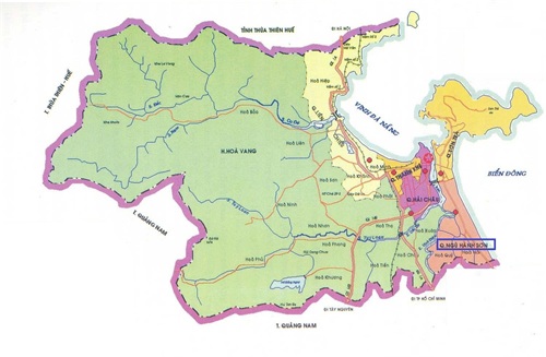 越南岘港市的行政区划地图如下所示,五行山郡就是右下角粉色的部分。