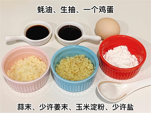 1个鸡蛋、蚝油、生抽、少许盐、蒜末,超级少量姜末、玉米淀粉、黑胡椒粉