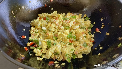 8.将鸡蛋炒至散开,煎至表面金黄就可以出锅了。