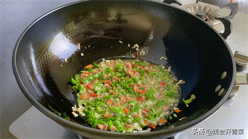 3.锅里多放一些油,将油温烧制5成热,先下入青红尖椒和葱花炒出辣香味。