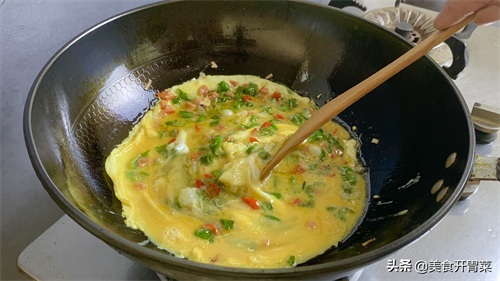 7.等鸡蛋煎至表面鼓起小泡时,再用铲子轻轻地往中间推动蛋液,让辣椒均匀地裹上一层鸡蛋液。