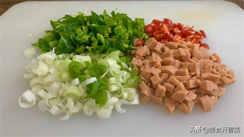 2.把尖椒切成辣椒丁,火腿切成碎丁,小葱切成葱花,小米椒切成辣椒碎用来配色,不能吃辣的可以不放。