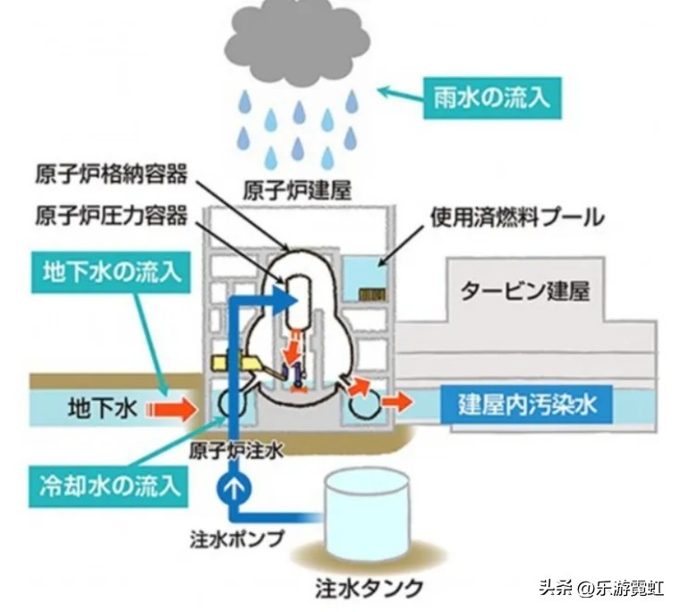 ②反应堆破损后,大量放射性物质泄漏到核反应堆外,由于福岛核电站地势较低,很多地下水和雨水源源流向福岛核电站区域 ,导致核污水越来越多。
