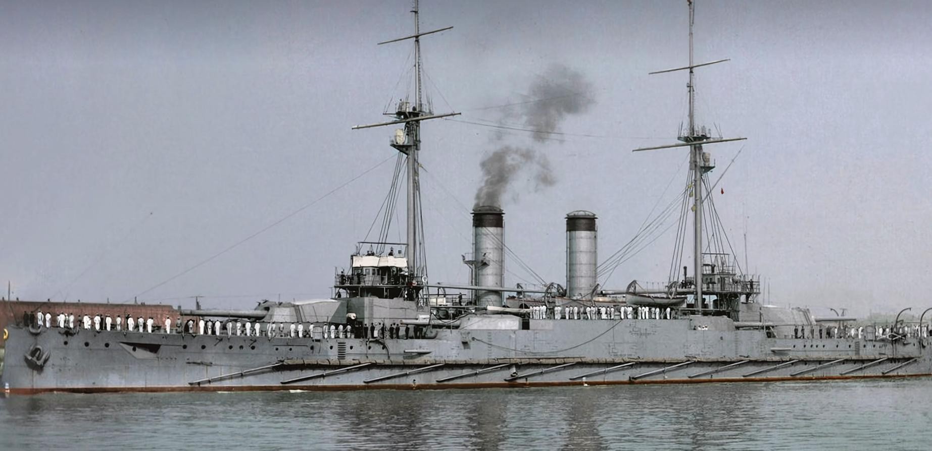 那从“君权”号之后,海军主力舰进入前无畏战列舰时代。在这个时代爆发的最有名的一场战役,无疑就是1905年进行的对马海战。在这场海战中,以三笠号为代表的主力舰,都是前后两座双联装主炮塔的设计,除此之外,便是布置在侧舷的一众中口径副炮。