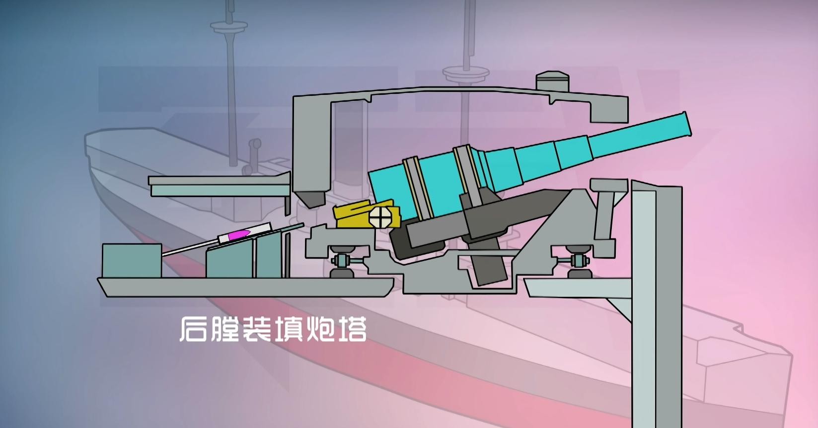 1886年服役的“巨人”号铁甲舰,采用了新式的后膛装填炮塔,液压机抬升身炮管至13.5度,炮弹自弹药舱被提升上来后由推弹杆推入炮膛,关闭炮栓后,火炮调整俯仰角进行开火。