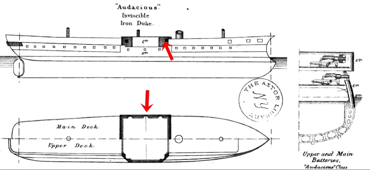 首先是铁甲的布置,是沿着整个船舷全面防护,还是只防护重要核心区?基于重量问题选择后者设计,便诞生了“中央炮郭舰”。它在船的中部用装甲围出了一个“炮房”,将火炮塞进去集中防御。这种又称为“船腰炮房铁甲舰”。