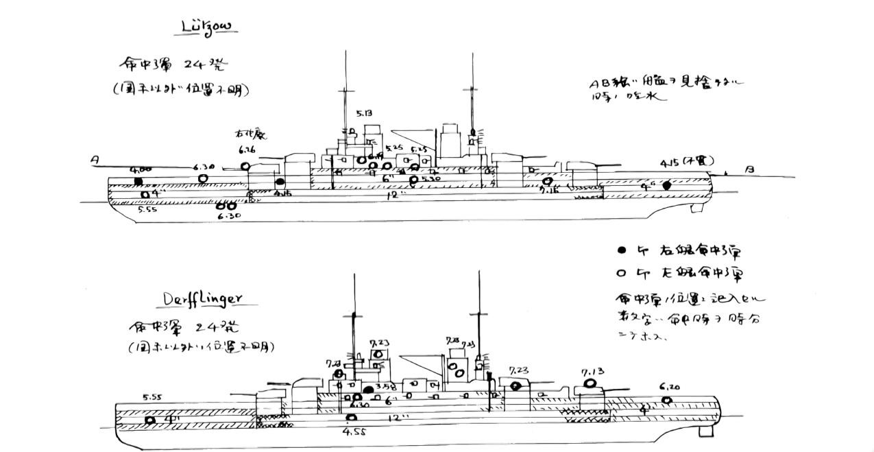 那为什么英国军舰在这场战斗中的表现会如此惨烈呢?日本后来的造舰鬼才藤本喜酒熊曾对日德兰海战的结果做过大量分析笔记。从记录上我们可以看出,德国的有些战巡中弹甚至达到20多发,但依然在海战中幸存了下来。是德国船装甲厚导致的吗?