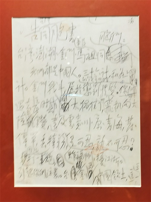 这部分历史,大部分人都很熟悉,我想说的只有一件文物。就是《告台湾同胞书》的草稿。很多人去搜网上搜《告台湾同胞书》,出来的都是在1979年1月1日在《人民日报》上刊登的那版。这次展出的草稿是整个文件的其中一页,看的出来就这一页上改动也是不小,仔细去看改动的部分,很值得琢磨。