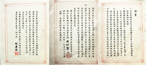 第五单元的一面墙上有六张文书,它们属于同一个文件——《日本降书》,降书上有何应钦和冈村宁次的签名。
