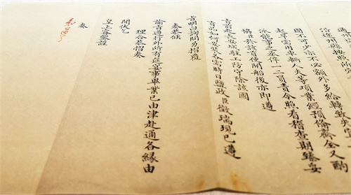 展厅第二单元中有一件展品,看似和台湾没有关系,但却和它命运有很大关联。它就是《直隶总督梁肯堂奏为筵宴英吉利使臣事毕照料开船前往通州事》。文物名字很复杂,简单说就是招待英吉利的使臣马戛尔尼这件事。