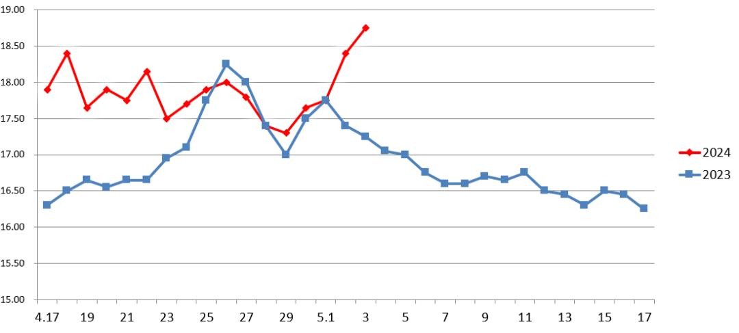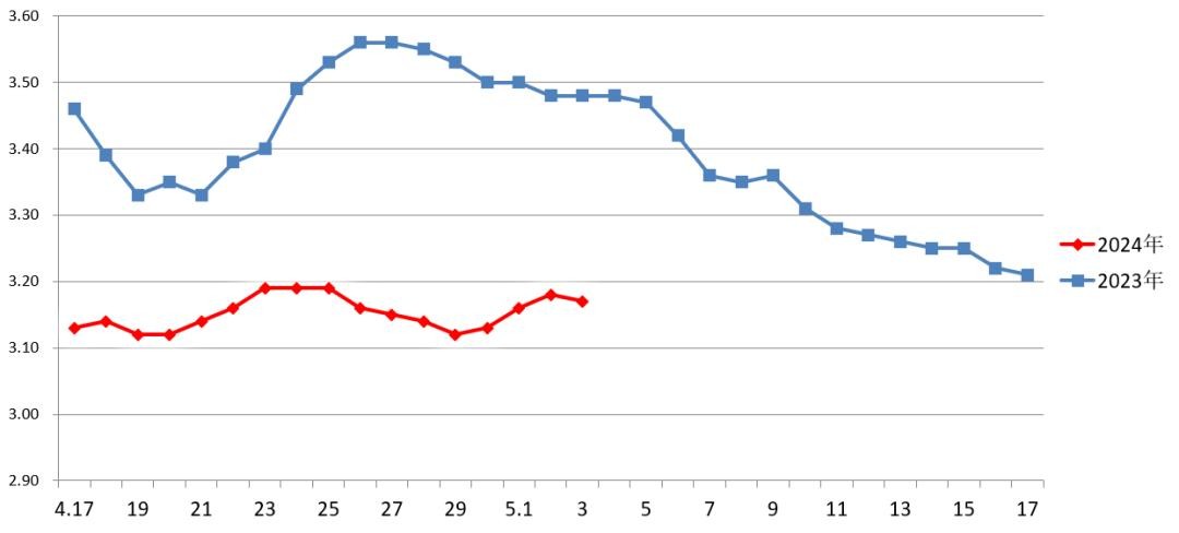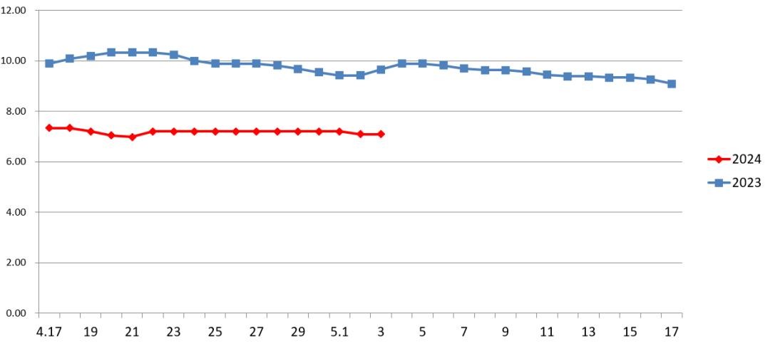 上周(4月29日-5月4日)前期,白条猪批发的平均价小幅回落,周后期反弹。2024年4月末-5月初与上年同期白条猪平均价走势对比图(单位:元/公斤)
