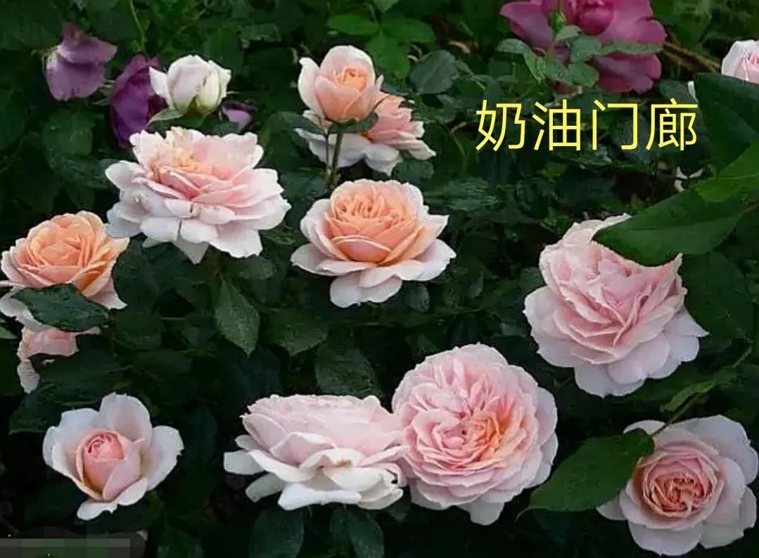 5.奶油门廊:株高50~60厘米,冠幅60厘米左右,平均花径6厘米,浅粉色,中等香水味,多季勤花。奶油门廊也叫奶油花环,米色、奶油色、杏色中心,温和的香水味,花瓣80枚,簇花,老式莲座型。枝条紧凑,叶片碧绿中等,半光泽。适宜花坛、边界、盆栽和挂篮。