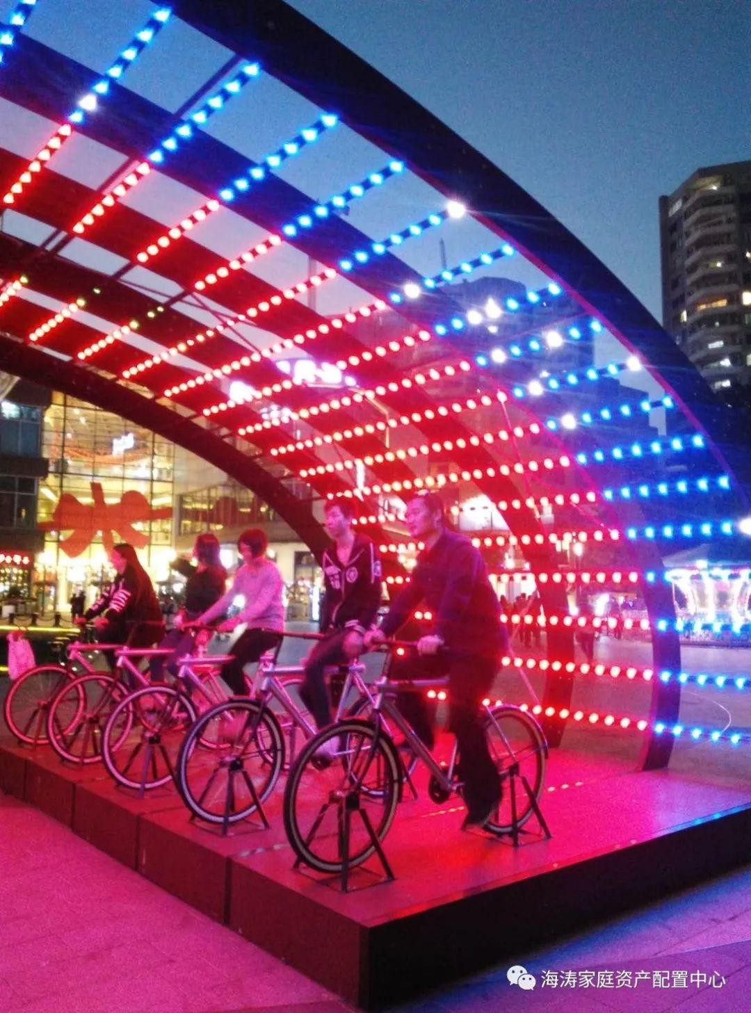 在这了发现一个比较好玩的是,三辆固定原地的自行车,蹬车越快,上面等灯光带就越闪耀。这个玩法在国外视频中见过,深圳还是与世界接轨啊,虽然只是一个小玩意。