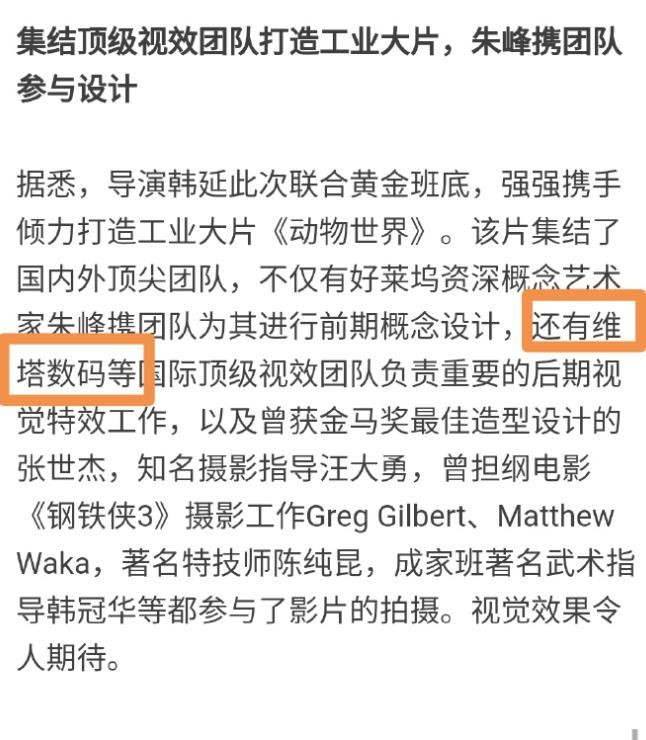 三是青年导演韩延颇为靠谱,因为前作《动物世界》特效就是和美国的维塔工作室做的,只要资金到位,再次合作可谓水到渠成。