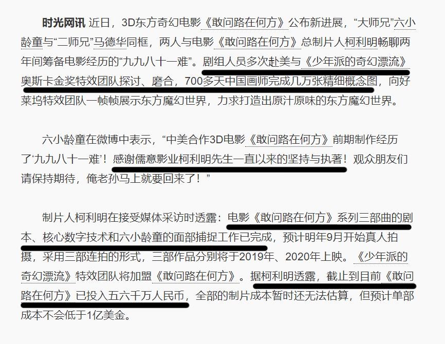 伯光上篇稿子详细考证过,六小龄童原来到处卖片的《敢问路在何方》,一直难产是背后主要电影公司就是儒意影业,当时号称要打造三部曲,单部投资1亿美元。