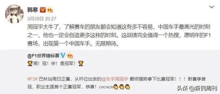 韩寒在微博上为周冠宇巴林站夺冠叫好