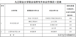 为贯彻落实教育部有关普通高校专升本考试招生工作精神,根据省教育厅相关文件要求,九江职业大学与华东交通大学、江西科技师范大学签订协议,开展本科层次技术技能型人才联合培养工作。联合培养专升本学生在华东交通大学、江西科技师范大学和九江职业大学的共同培养下完成两年本科阶段的学习,培养地点在九江职业大学。