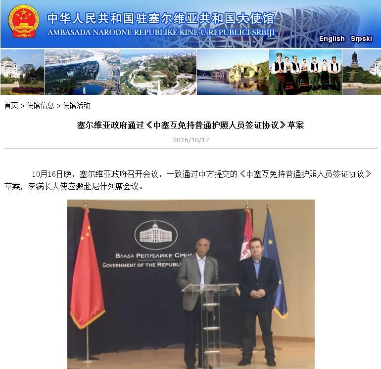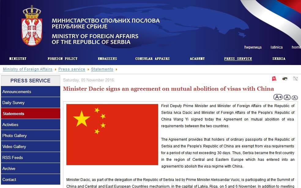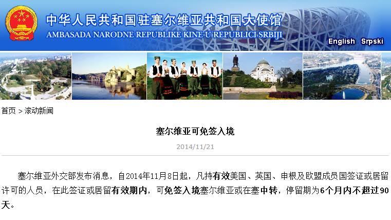 塞尔维亚成为第一个和中国取消了签证制度的中欧及东欧国家”。