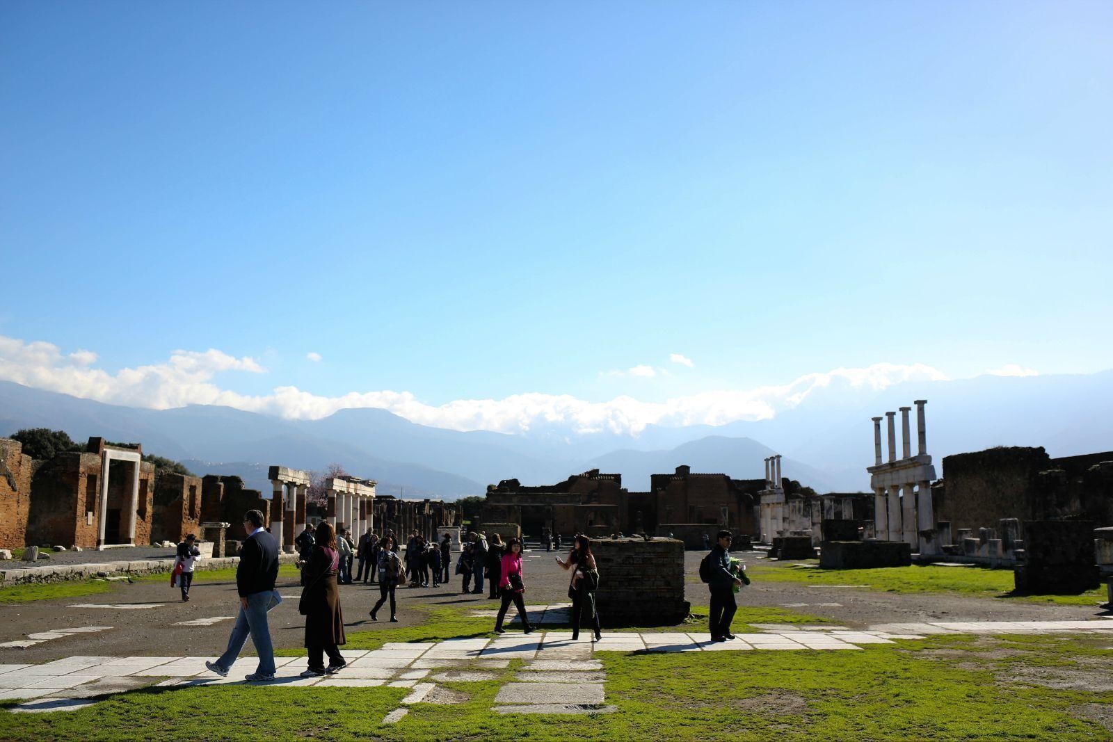 庞贝两千多年前就具有相当高度的文明,曾经繁华一时。当时古城政治、宗教、经济和娱乐的中心在城西南的三角广场,这里有市政厅、法院等政府各机构办公的地方、有可容纳1200名观众的室内剧场,更有阿波罗神庙、宙斯神庙等几座神庙,其中在广场主轴线上的宙斯神庙后面,就是历历在目的维苏威火山。广场四面残留了高达数米的粗大石柱、雕刻精细的大理石门框和石板地基,,可以遥想当年的雄伟壮观。