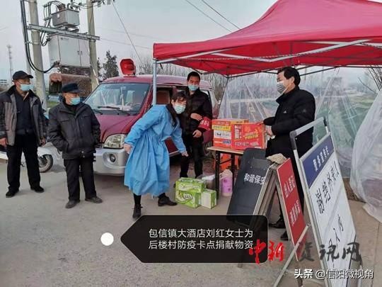2月10日,包信大酒店负责人刘红向朱围孜、包庄、付庄等10个村委疫情防控卡点捐赠方便面、矿泉水等物资,同心战疫情。
