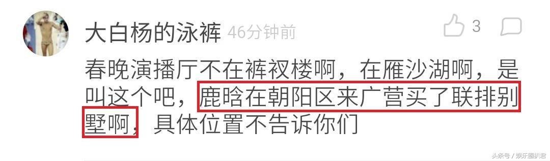 北京的朋友还知道在他北四环的朝阳区也有房子~ 而且还爆料春晚演播厅在雁沙湖,鹿晗是在朝阳区买的联排别墅~