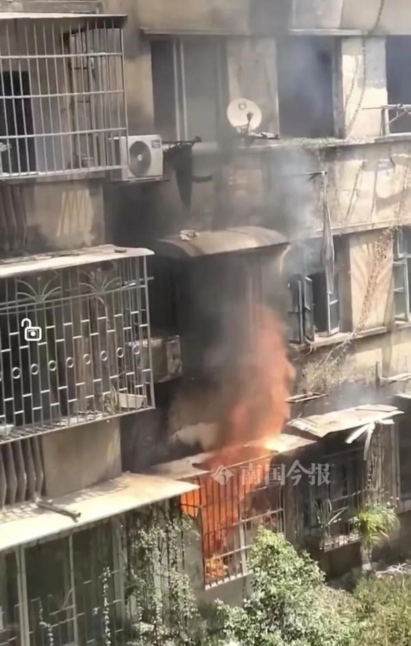 记者从视频中看到,2楼窗户不断有大量火苗蹿出,伴有滚滚浓烟,还有晾晒的衣物在浓烟中飘动。