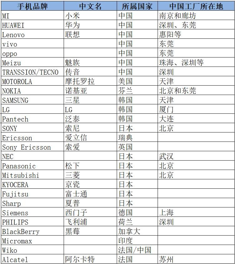先来看看目前世界上的主要手机品牌,如下表所示,数据来自网络,如有不实还请谅解。
