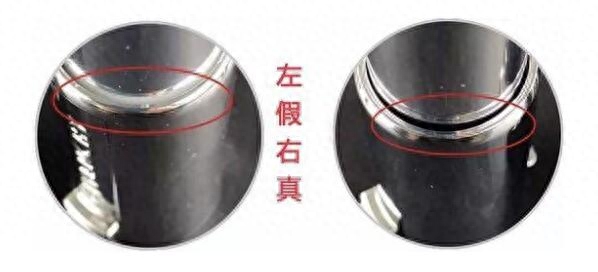 整体盖紧以后,正品的卡口上方与左右都有差不多大的缝隙,假货的缝隙则是上方比左右两侧大很多