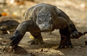 科莫多巨蜥是已知现今存在种类中最大的蜥蜴。它扑食动物时,凶猛异常,奔跑的速度极快,而且它有自己的生物武器,被其咬伤的猎物血压降低进而流血不止然。