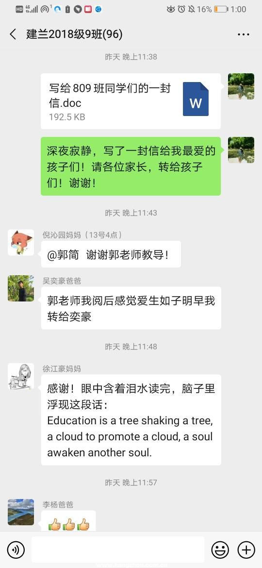 杭州网讯 “深夜寂静,写了一封信给我最爱的孩子们!请各位家长转给孩子们,谢谢!”2月3日凌晨,杭州建兰中学804班班主任郭简给自己的学生们写了一封信,并同步发布在了班级群和朋友圈。深夜的朋友圈被这封动人的信瞬间点燃。