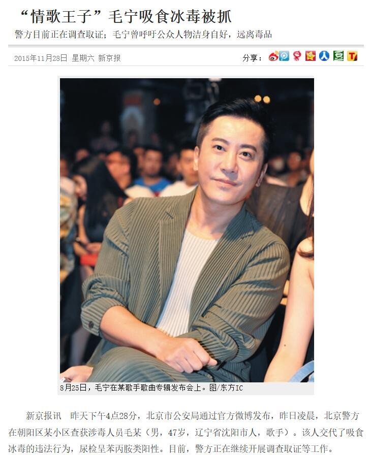 2015年底,47岁的毛宁被朝阳区群众举报吸毒,先是行政拘留,后因不符合羁押条件获释。