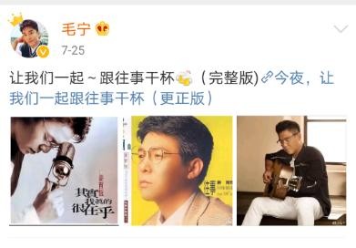 在微博里,他推荐《跟往事干杯》,推荐《谁明浪子心》,并真诚写到:"今夜,让我们一起跟往事干杯",字里行间浸透了对过往的无奈和悔恨。