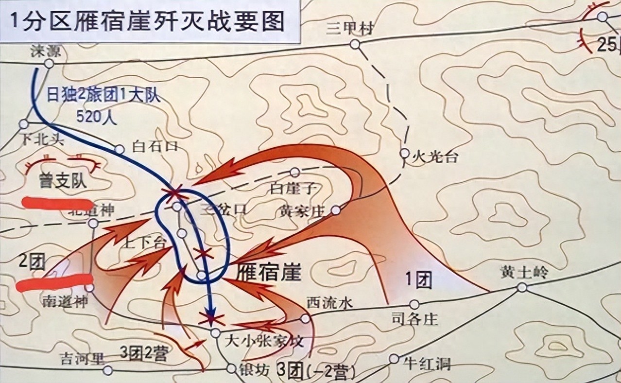 下午4时半,我第1军分区1团、3团和第3军分区2团围歼雁宿崖小高地之敌的总攻开始了。3团1营担任对这个高地的主攻,10多挺机枪朝小高地顶端猛扫,3连乘势冲上了山顶。日军倾巢扑来,山头上展开了白刃格斗。经过三次反复冲锋,到夕阳西下时,我军完全占领山顶。3团2营主力在雁宿崖村西北的山头上同日军展开了激烈的战斗,敌我双方短兵相接,先是白刃战,后来是石头战。最后,顽抗之敌终于被消灭。1团2营、3营紧紧围住村西的一个院子,这是日军的指挥所。机枪、步枪不断地向院子里射击,手榴弹纷纷投进屋里,日军的机枪哑了,围攻的部队乘势冲进院子,将敌歼灭。