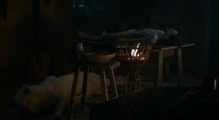 估计是去安排火葬了吧……而就在这时,屋子里只剩下了冰原狼“幽灵”和雪诺的尸体……